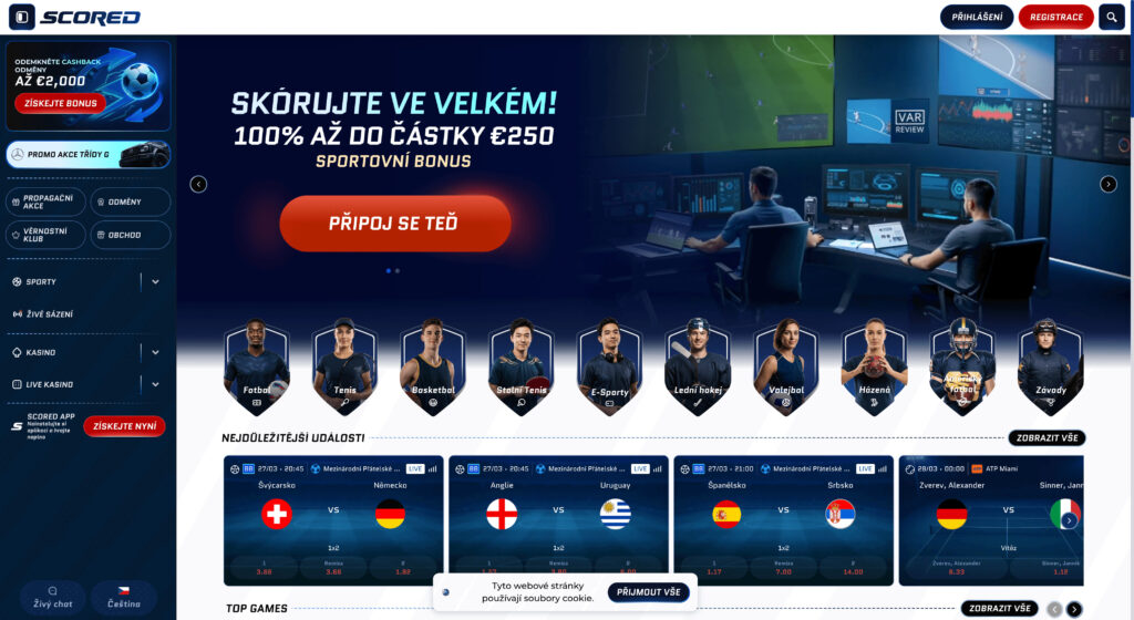U Scored se nám líbí, jak plynule propojili sázkovou kancelář s casino lobby. Žádné přepínání mezi sekcemi, žádné dva účty. Fotbal nabízí přes 999 live událostí, k tomu tenis, basketbal, hokej, MMA i e-sporty.