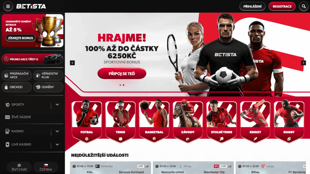 Největší prostor samozřejmě dostává fotbal. Betista pokrývá hlavní evropské ligy, velké mezinárodní turnaje i řadu menších soutěží. U populárních zápasů je na výběr dost sázek – od klasického tipu na výsledek přes handicapy a totály až po různé doplňkové nebo kombinované sázky. Podobně je na tom i tenis a basketbal, kde je nabídka dostatečně široká pro běžné i pravidelné sázení.