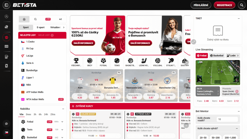 Betista je mezinárodní bookmaker, který nabízí širokou sportovní nabídku, silné zaměření na esport a sekci virtuálních sportů. V této recenzi se podívám na hlavní výhody i slabiny platformy – kurzy, výplaty, nabídku trhů i fungování webu. Analýza vychází z praktického testování služby včetně zákaznické podpory a celkové funkčnosti webu a ukazuje, zda má Betista pro české sázkaře skutečnou hodnotu.