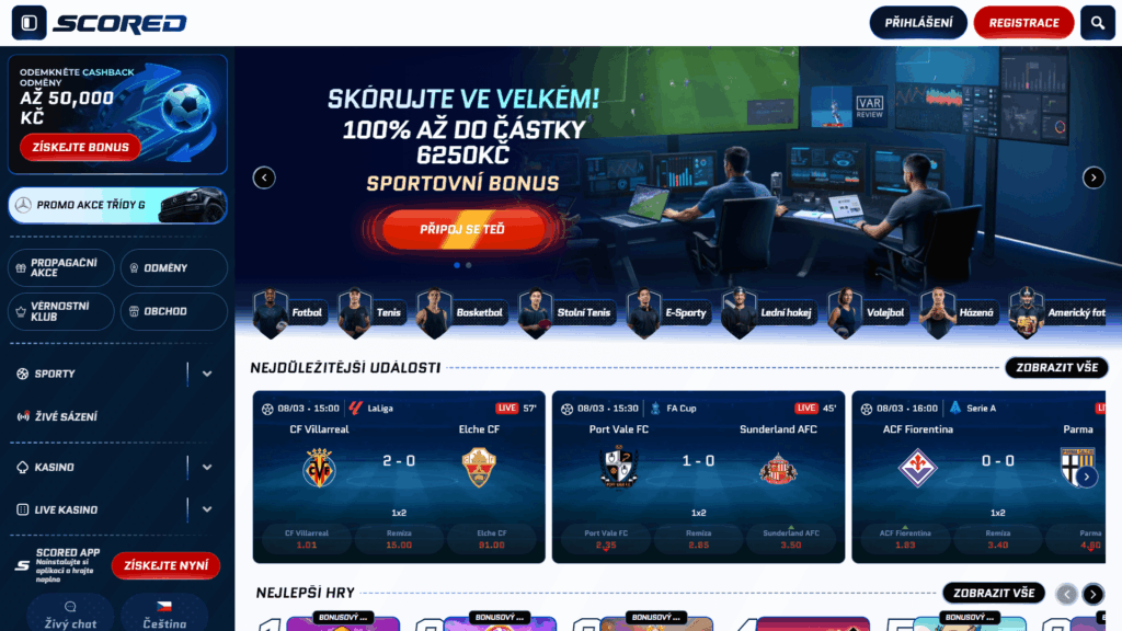 Platformu Scored jsem vyzkoušel jak na počítači, tak na telefonu, a hned jsem si všiml, že rozhraní je rychlé a přehledné i při aktivním sázení. Navigace je jednoduchá, takže hlavní sekce najdeš během pár kliknutí.