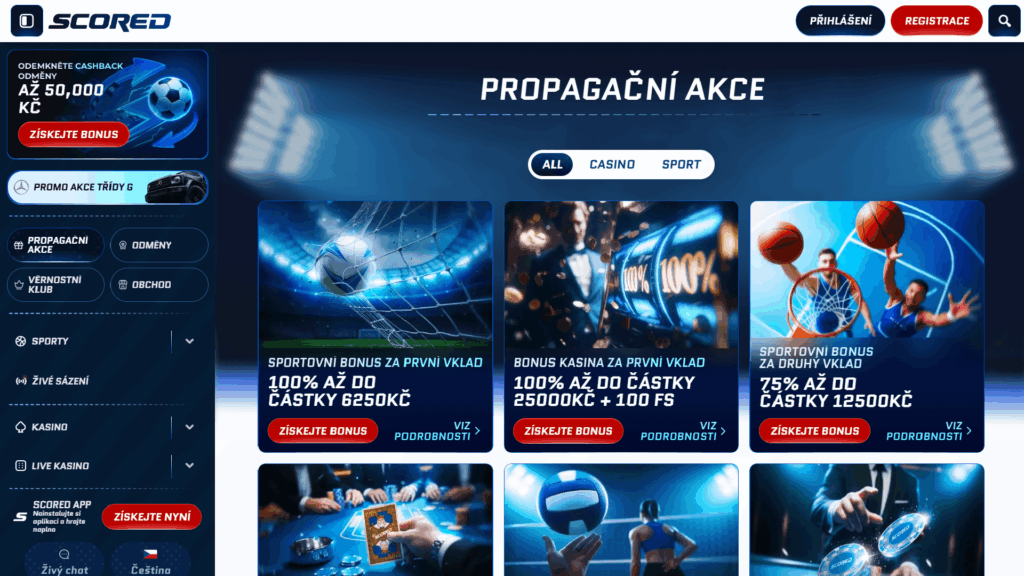 Když jsem testoval Scored, všiml jsem si, že všechny sportovní bonusy mají vlastní přehlednou sekci, takže se v aktuálních akcích dá rychle zorientovat. Najdeš tu uvítací bonus pro nové hráče i různé pravidelné promo nabídky, například sázky bez rizika, cashback, týdenní soutěže nebo speciální akce na vybrané zápasy. V dalších částech se na tyto bonusy podívám podrobněji. Ukážu, jak fungují, co je potřeba pro jejich aktivaci a jakou reálnou hodnotu mohou při sázení přinést.