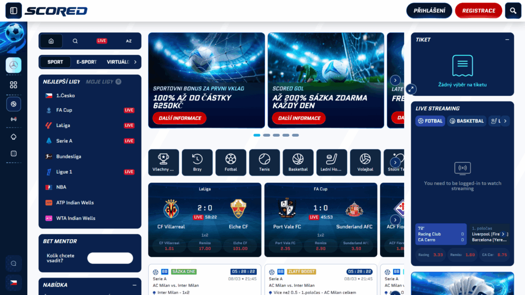 Když jsem otevřel sekci sázek na Scored, hned jsem si všiml poměrně široké sportovní nabídky. Najdeš tu populární ligy, velké turnaje i několik méně populárních sportů. Pro běžné sázení je výběr více než dostačující.