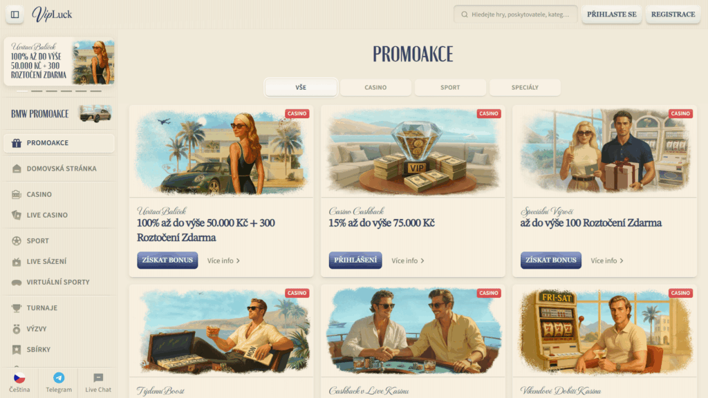 - Vizuální styl: Rozhraní používá béžové pozadí, zlaté akcenty a výrazné promo bannery, což vytváří lehce retro vzhled.