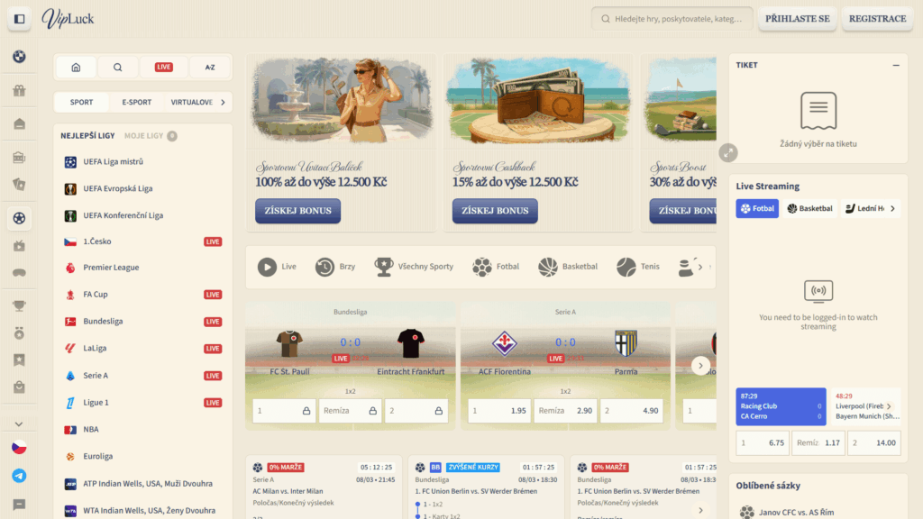VIP Luck je mezinárodní online bookmaker zaměřený především na sportovní sázení a live sázky. Nové hráče láká uvítací balíček až 12 500 Kč. V recenzi se zaměřuji na klíčové věci – kurzy, šíři sázkových trhů, platby, rychlost výplat i mobilní použitelnost webu. Zaměřím se přitom jak na silné stránky služby, tak na oblasti, kde má platforma rezervy. Recenze vychází z praktického testování a ukazuje, jak si VIP Luck vede z pohledu běžného sázkaře.