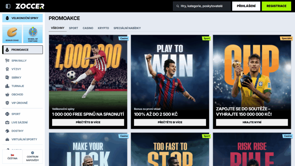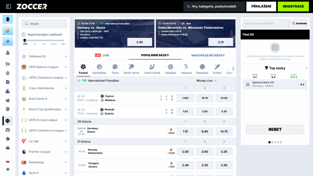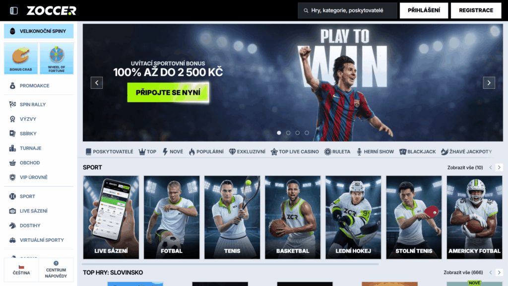 Zjistil jsem, že Zoccer se snadno používá jak v prohlížeči na počítači, tak v mobilním prohlížeči. Na počítači nabízí menu na levé straně rychlý přístup ke sportům, live sázkám, kasinu a dalším hlavním sekcím. Přihlášení a registrace se nacházejí vpravo nahoře, takže noví uživatelé mohou začít bez zbytečných kroků.
